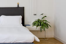 Enfin, avis aux bricoleurs qu'un peu de maçonnerie ne rebute pas, l'option tête de lit en briques de verre est à considérer. Robuste, elle offre un dossier sûr dans un style intemporel et laisse passer la lumière tout en créant une cloison avec une salle de bains ouverte sur la chambre, par exemple. Égayez à votre guise le plateau du dessus avec vos bibelots préférés ou des plantes joliment vaporeuses.