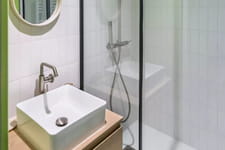 Une cabine de douche trouvera également facilement sa place et aura l'avantage d'être très compacte. Préférez alors un modèle avec un receveur plat et des parois en verre afin de donner plus de sensation d'espace.