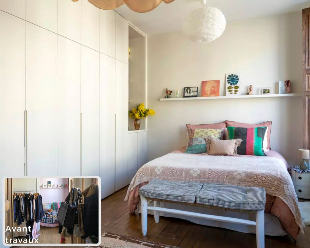 La cliente manquait de place. L'appartement avait trois chambres alors qu'elle vivait seule avec sa fille. L'architecte a donc cassé une cloison pour agrandir sa pièce de nuit : elle a ainsi pu créer un grand placard et cacher, par une astucieuse idée, la porte menant à la salle de bains. Cette dernière avait été refaite par un architecte, il y a longtemps. Fan de rétro, la cliente souhaitait un style plus à son goût et plus de rangements pour que la pièce soit moins en bazar. Cyrielle Benaïm a réussi à modifier l'espace avec des touches anciennes et d'autres plus originales. Valentine Bounaud, la propriétaire, s'est elle-même occupée de la décoration et du mobilier. La difficulté de cette réalisation a été de garder un charme bohème avec des meubles au style très affirmé tout en organisant au mieux l'espace et c'est parfaitement réussi. Le bien est atypique et, grâce aux bonnes idées de l'architecte, il est bien plus pratique et offre un cachet incroyable. On vous laisse le découvrir.- Durée du chantier : 3 mois