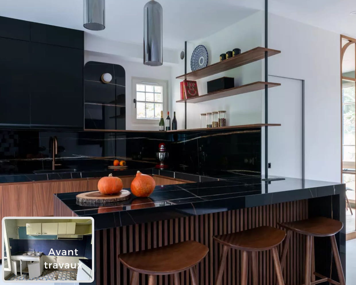 Au rez-de-chaussée, leur souhait était de tout décloisonner et pour cela, il fallait casser un mur porteur. Le bureau d'étude d'Améo Concept a étudié la chose avec précision et sérieux. Comme il y avait un sous-sol en dessous, il a fallu prévoir une reprise bien solide pour que cela tienne. L'ancienne salle de bains (au même niveau que les pièces de vie) a été transformée en espace polyvalent, pouvant servir à la fois de bureau et de chambre d'appoint. La pièce est très lumineuse puisqu'elle donne sur le jardin et pensée pour Madame, artiste. Ce lieu devait rester ouvert tout en pouvant être fermé, d'où l'installation d'une verrière sur-mesure. Le couple avait également une idée précise du style de la cuisine qu'il voulait, dans des tons sombres. Et c'est justement ce style qui a servi de fil conducteur pour la décoration de l'ensemble du rez-de-chaussée. À l'étage, deux chambres élégantes ont été aménagées, dont l'une comporte un espace bureau pour Monsieur. L'ancien débarras avec point d'eau a été transformé en une salle de bains spacieuse, c'est bien plus pratique de l'avoir près des chambres. Et les combles ont été aménagés afin d'offrir d'un dressing spacieux et fonctionnel. Grâce à ce projet de rénovation ambitieux, la maison a retrouvé tout son cachet et a été modernisée pour offrir un confort optimal à ses nouveaux occupants.- Durée des travaux : plus d'une année
