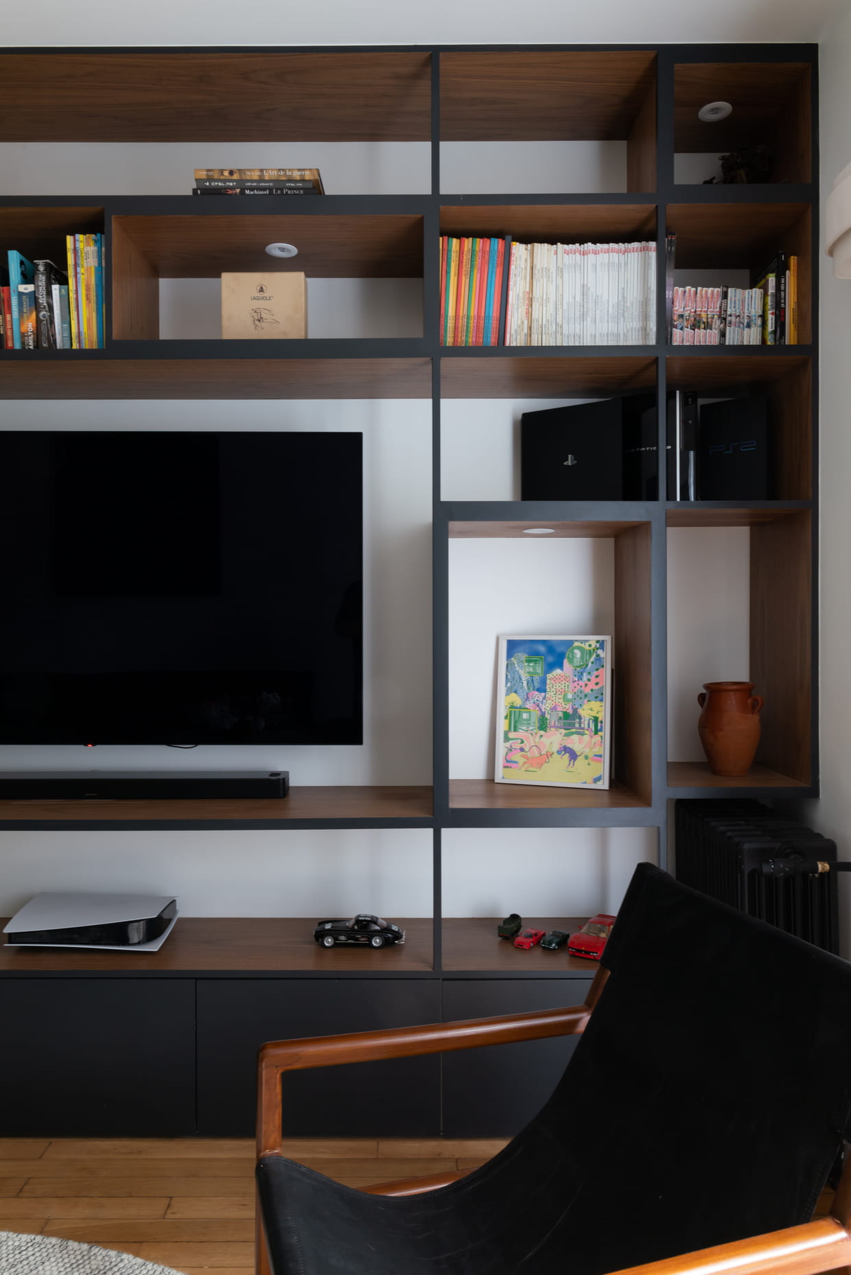 Après : un salon avec un meuble télé rappelant les couleurs de la cuisine