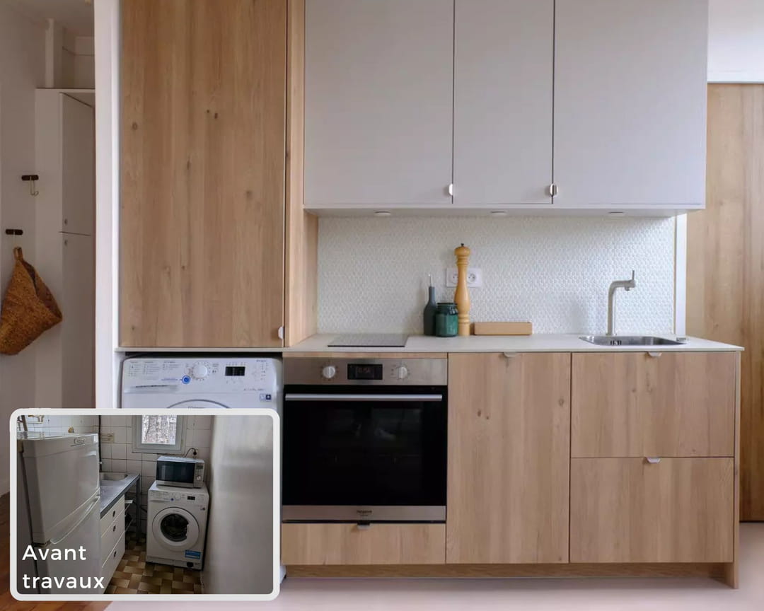À la suite du départ du précédent locataire, le propriétaire a profité de cette période de transition pour remettre le logement aux normes. Clémentine Pautrot a d'abord mené un important travail d'isolation afin d'obtenir un bon classement au diagnostic de performance énergétique (DPE). Autre enjeu majeur : optimiser les volumes pour permettre une éventuelle (co)location. La pièce principale a donc été repensée de fond en comble pour devenir un espace à la fois convivial, fonctionnel et ouvert. Quant à la cuisine d'origine, c'était une pièce close, si étroite qu'elle ressemblait à un couloir, sans réelle profondeur ni confort. Inutile de vous dire qu'elle n'avait rien d'une vraie cuisine !