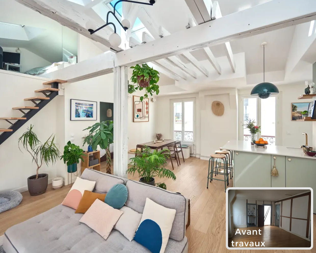 Ce couple avec un bébé en route savait exactement ce qu'il voulait : un dernier étage avec des combles à récupérer afin d'avoir une vue sur le ciel, de mieux respirer et de pouvoir tout modifier selon leurs goûts. Ils ont donc visité cet appartement dans le XVIIᵉ arrondissement de Paris qui correspondait à ce qu'il recherchait. Quand Angélique Lagache de Cactus Architecture leur a confirmé ce qu'il était possible de faire, ils n'ont pas hésité une seule seconde. Pourtant, ce bien avait quelques défauts comme des pièces en enfilade, il était bas de plafond et assez sombre. Mais ce trois-pièces avait aussi des atouts non exploités, qui ont su être mis en valeur par l'architecte.