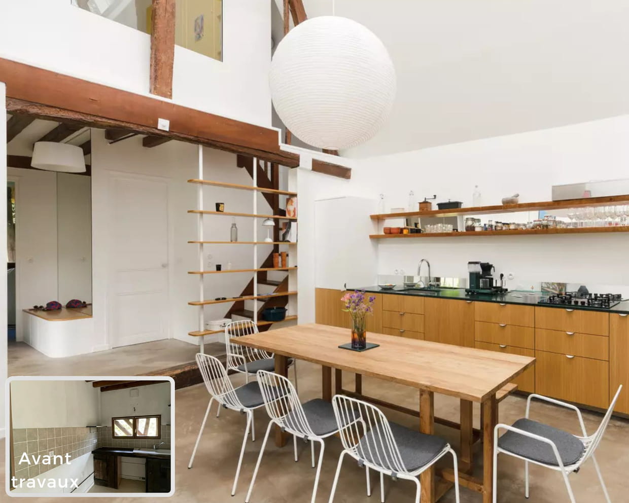 Chaque niveau était un grand espace ouvert au rez-de-chaussée ainsi qu'à l'étage. "Avec toutes ces ouvertures, ces connexions, de niveau à niveau, on a essayé de garder un visuel entre chaque point de vue afin qu'on puisse se voir, mais qu'il puisse y avoir autant d'intimité que de partage", explique Rémy Bardin. C'est pourquoi à l'étage, ils ont installé une grande fenêtre dans l'espace dortoir permettant de voir le reste de la mezzanine. De la même façon, en face, il n'y a pas de mur et la pièce appelée "salle de projection" est en partie ouverte. Au rez-de-chaussée, c'est pareil. Le salon, la salle à manger et la cuisine cohabitent dans un grand espace, sans cloison. Il a fallu composer avec la charpente de la structure qui prend beaucoup de place. Il y a aussi l'atelier qui ne communiquait pas avec la maison et qui a été rattaché - en abattant un mur. Cela a permis de créer une sublime chambre parentale en pleine nature avec sa salle d'eau. Les angles et les coins sous pente ont été aménagés avec des meubles sur-mesure pour s'accorder avec les formes du logement. Quelques pointes de couleur, des pièces fortes et d'autres aux teintes plus sourdes apportent une sorte de quiétude à cette élégante maison de campagne qui n'a pas perdu de son charme avec cette rénovation, bien au contraire.- Durée du chantier : 6 mois