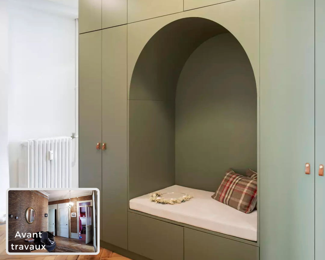 Mais attardons-nous sur l'espace d'accueil de l'appartement. Déjà très sombre, l'entrée d'origine était habillée d'une toile de jute foncée et avait vraiment besoin d'être repensée pour devenir plus fonctionnelle. Au sol, le parquet, lui, conservait tout son charme.
