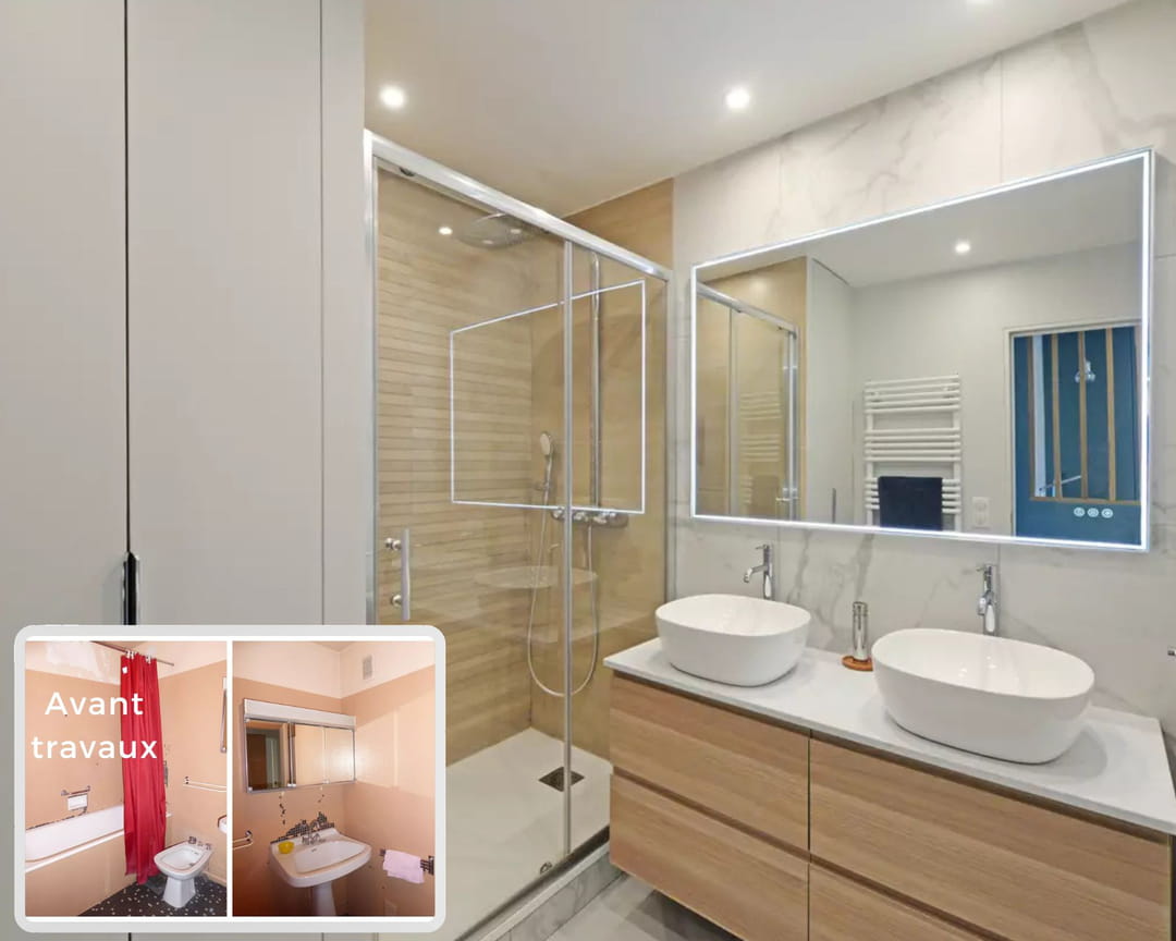 Intéressons-nous plus en détail à l'unique pièce d'eau du logement : une salle de bains d'époque qui avait besoin d'un sérieux coup de frais, vous ne trouvez pas ? Avec ses volumes contraints et ses finitions vieillissantes, elle faisait peine à voir. Ses équipements datés n'arrangeaient rien et la lumière faisait défaut. Heureusement, le potentiel était là et n'attendait que d'être révélé.