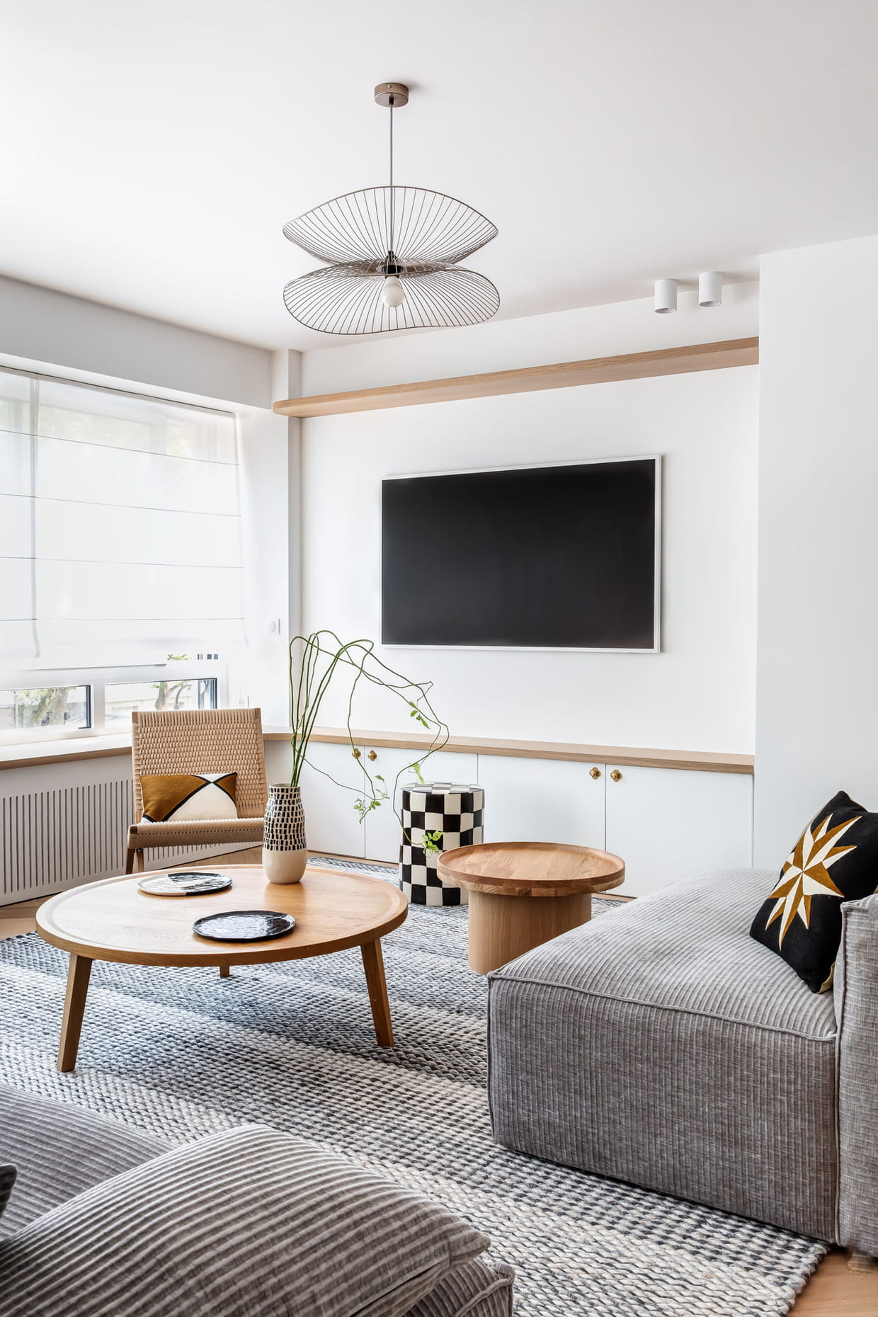 Après : un salon chic aux tons neutres