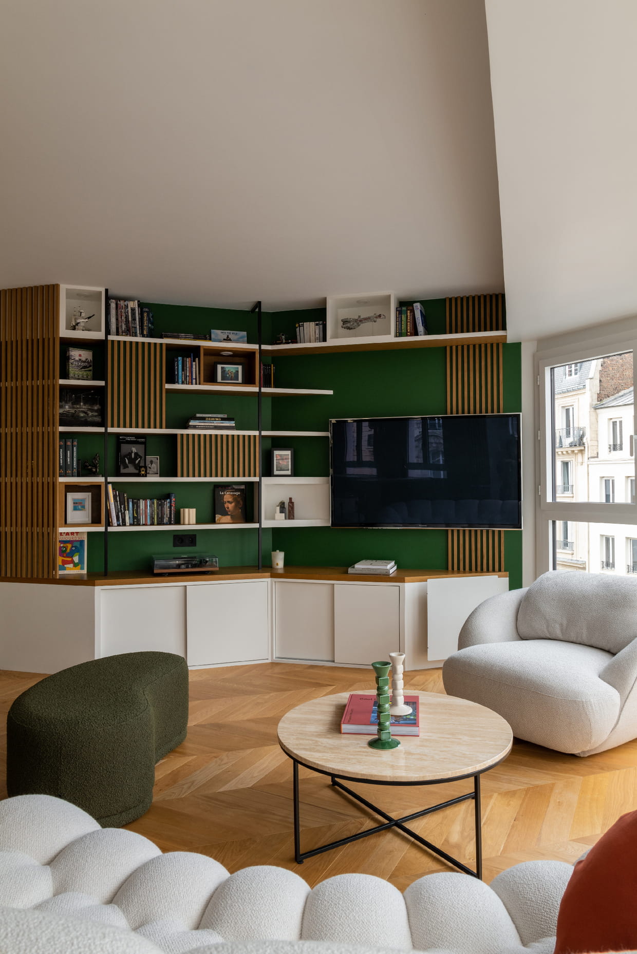 Après : un salon plus harmonieux avec plein de rangements