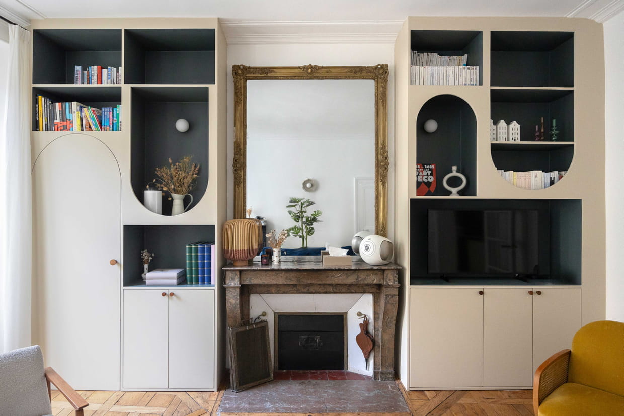 Après : un grand meuble aussi beau que fonctionnel entoure la cheminée