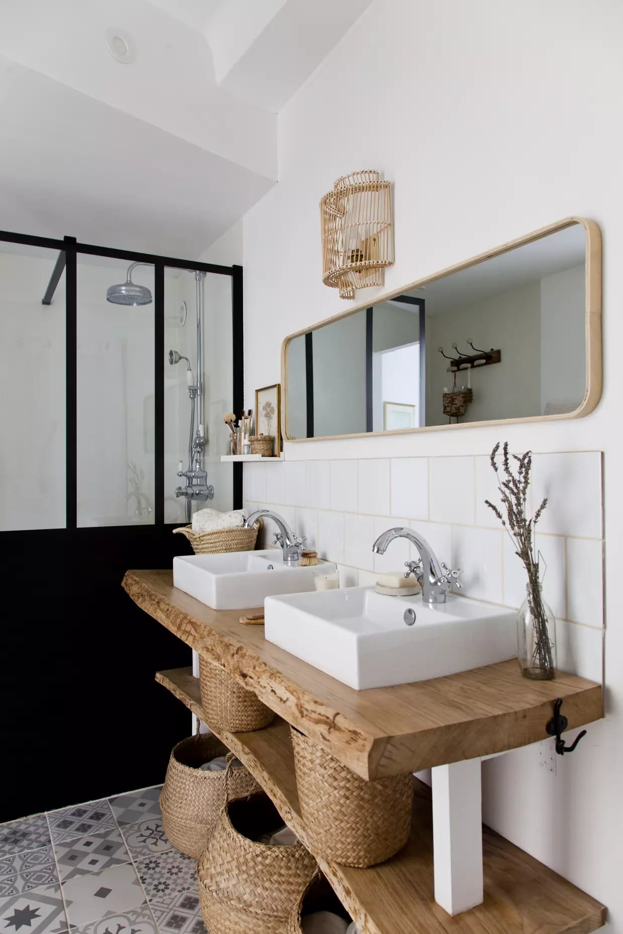 Les épais plans de travail en chêne qui composent ce meuble vasque ont été dénichés chez un revendeur local. Façonnés par les propriétaires des lieux, ils s'adaptent ainsi parfaitement à l'espace disponible. Une suspension et des paniers tressés complètent le décor. En guise de touche finale, un miroir vertical Sostrene Grene a été détourné et installé à l'horizontale, top idée !