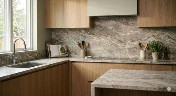 Mais l'association la plus sympa est celle du taupe clair avec le bois clair. Elle montre d'ailleurs une cuisine avec un plan de travail, une crédence en marbre taupe et des placards en bois clair. Il y a aussi une salle de bains avec des vasques et une baignoire style marbre taupe, des paniers en bois clairs et des plafonniers en osier. Aussi, c'est très doux et sympa dans une chambre avec une tête de lit, une chaise, une table de chevet en bois et un tapis ainsi qu'un couvre-lit taupe.