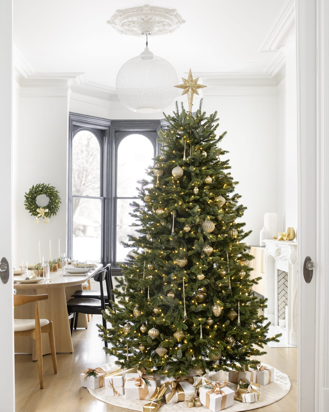 Et c'est là que réside le secret : un espace de 20 à 30 cm entre la cime et le plafond permet de maintenir des proportions équilibrées et de laisser la décoration s'exprimer pleinement, révèle Balsam Hill, roi du sapin de Noël artificiel. Ce léger intervalle crée une respiration visuelle, évite l'écrasement du sommet et met en valeur l'étoile ou la guirlande finale.