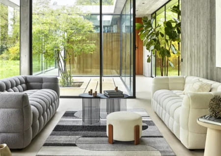 Côté matières, on retrouve principalement deux revêtements : la bouclette, douce et duveteuse, qui accentue le côté cocooning, et le tissu bubble polyester, à l'effet capitonné plus marqué visuellement. Dans les deux cas, le résultat est immédiat. On entre dans le salon, on le voit, et on n'a plus qu'une envie, s'y lover.
